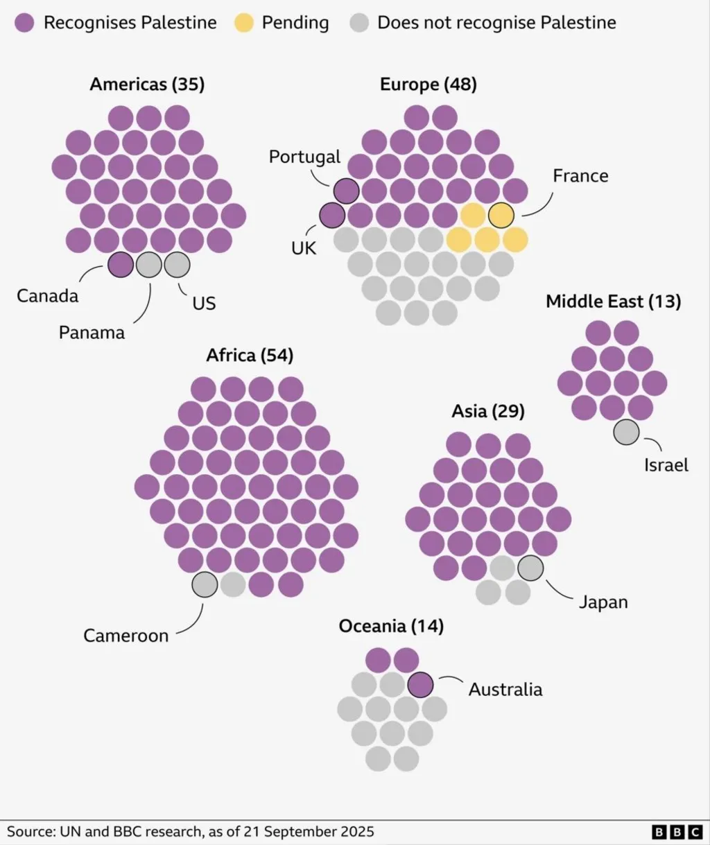Skupina zemí, které se rozhodly uznat Palestinu jako stát, se dále rozšiřuje. Děje se tak během letošního Valného shromáždění OSN, na němž se schází vždy v září v New Yorku hlavy států a vlád z celého světa. Aktuální vlna uznání zahrnuje převážně země Evropy — posledního světadílu, jenž byl v otázce palestinské státnosti dosud rovnoměrně rozdělený. Nyní tedy i v Evropě získává navrch blok uznávajících převahu — podobně, jako ji má už delší dobu v Asii, Americe i Africe.