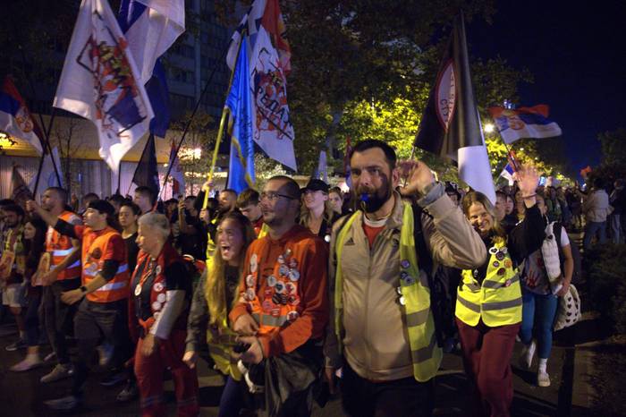 Kdykoliv se některý z pochodů přiblíží, studentka v reflexní pořadatelské vestě hlásí do mikrofonu jména měst, z nichž příchozí pochodují: Čačak, Šabac! Nato lidé extaticky mrští pěstí do vzduchu, zvolají „bravo“ a roztleskají se, jako by každé ohlášené město bylo jejich vlastním.