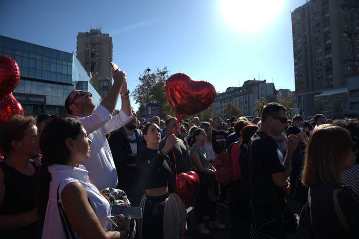 Dnešní shromáždění není protestem, nýbrž shledáním. Neskandují se hesla, nezní plamenné politické projevy — ačkoliv z pódia jasně zaznělo, že kdyby v Srbsku vládlo právo, nebylo by zemřelých. Po tíživém tichu se lidé postupně uvolňují a korzují tam a zpět Bulvárem Osvobození. Počasí stojí na straně shromáždění: omamně ostré slunce, teplota šplhající až k pětadvaceti stupňům.