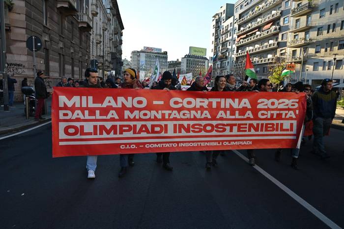 Dnešní demonstrace za dostupné bydlení se účastní i řada lidí, kteří v rukách třímají červený banner, na němž se velkými bílými písmeny píše „Milano Cortina 2026. Neudržitelná olympiáda od hor až do města. C.I.O. — Výbor neudržitelné olympiády“. Zkratka jejich kolektivu je hříčkou — C.I.O. je totiž v italštině zároveň zkratka Mezinárodního olympijského výboru.